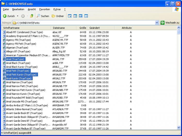 Wenn Sie im Windows-Fonts-Ordner nachsehen, werden Sie feststellen, dass zu einer guten Schrift tatsächlich mehrere Schrift-Dateien vorliegen, nämlich für magere, fette und kursive Auszeichnungen getrennt:
