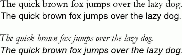 Schriftunterschiede für kursive Auszeichnung (von oben: Antiqua, Grotesk, Antiqua kursiv, Grotesk kursiv)