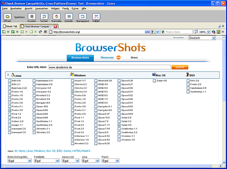Da Sie kaum alle Browser zu Testzwecken betreiben können, bietet BrowserShots automatische Screenshots von beliebigen Browser-Versionen auf verschiedenen Betriebssystemen: