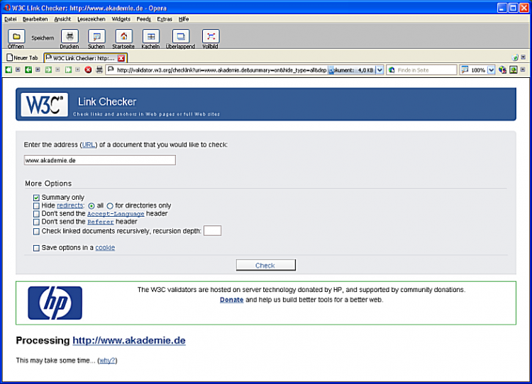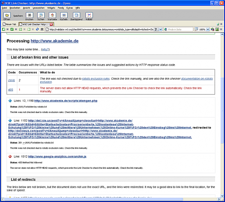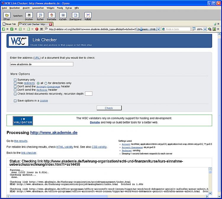Für eine eher größere Site wie www.akademie.de braucht dieser Link Check insgesamt rund 464 Sekunden, also fast 8 Minuten: