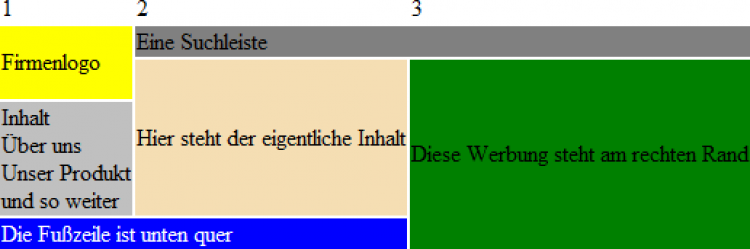 <table> <tr> <td>1</td><td>2</td><td>3</td> </tr> <tr> <td rowspan="2" style="background-color:Yellow;" height="50px">Firmenlogo</td> <td colspan="2" style="background-color:Gray;">Eine Suchleiste </td> </tr> <tr> <td rowspan="2" style="background-color:Wheat;">Hier steht der eigentliche Inhalt</td> <td rowspan="3" style="background-color:Green;">Diese Werbung steht am rechten Rand </td> </tr> <tr> <td style="background-color:Silver;">Inhalt< br />Über uns< br />Unser Produkt< br />und so weiter</td> </tr> <tr> <td colspan="2" style="background-color:Blue;color:White;">Die Fußzeile ist unten quer</td> </tr> </table>