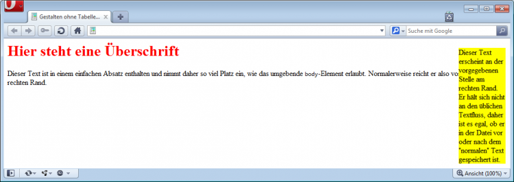 <!DOCTYPE HTML PUBLIC "-//W3C//DTD HTML 4.01 Transitional//EN"> <html> <head> <meta http-equiv="content-type" content="text/html; charset=ISO-8859-1;charset=windows-1252"> <title>Gestalten ohne Tabellenquäerei</title> <link rel="stylesheet" type="text/css" href="standard.css"> </head> <body> <h1>Hier steht eine Überschrift</h1> <p>Dieser Text ist in einem einfachen Absatz enthalten und nimmt daher so viel Platz ein, wie das... <!-- wie bisher --> </body> </html>