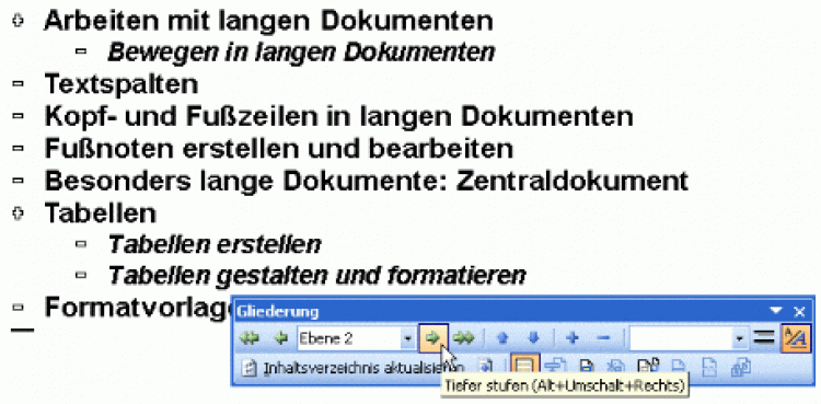 Um einer Überschrift eine andere Überschriftenebene zuzuweisen, setzen Sie die Einfügemarke in die betreffende Überschrift und klicken Sie auf die Symbole Höher stufen bzw. Tiefer stufen. Gliederungsstufen werden durch stufenweises Einrücken vom linken Rand dargestellt.