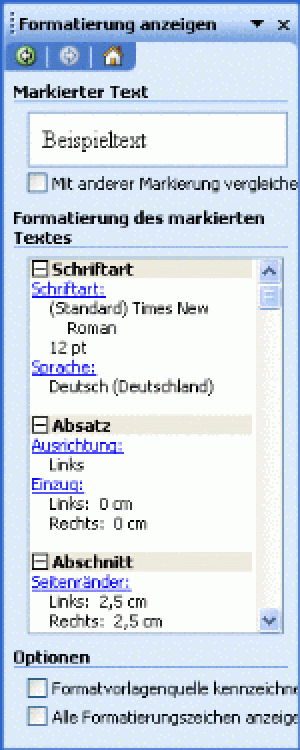 Um sämtliche Formatierungsmerkmale (Schrift-, Absatz- und Abschnittsformatierungen) anzuzeigen, blenden Sie den Aufgabenbereich Formatierung anzeigen über das Menü Format ein und klicken Sie in den Text, über den Sie genaue Informationen haben wollen. Sie können hier auch die Formatierung zweier Textstellen vergleichen. Aktivieren Sie dafür das Kontrollkästchen Mit anderer Markierung vergleichen und klicken Sie anschließend in die zweite Textpassage. Das Ergebnis des Vergleichs wird im Listenfenster Formatierungsunterschiede aufgelistet.