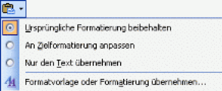 Der Smarttag Einfügen-Optionen erscheint nach dem Einfügen, ein Klick auf das Dreieck neben dem Symbol macht Optionen zur Formatierung sichtbar.