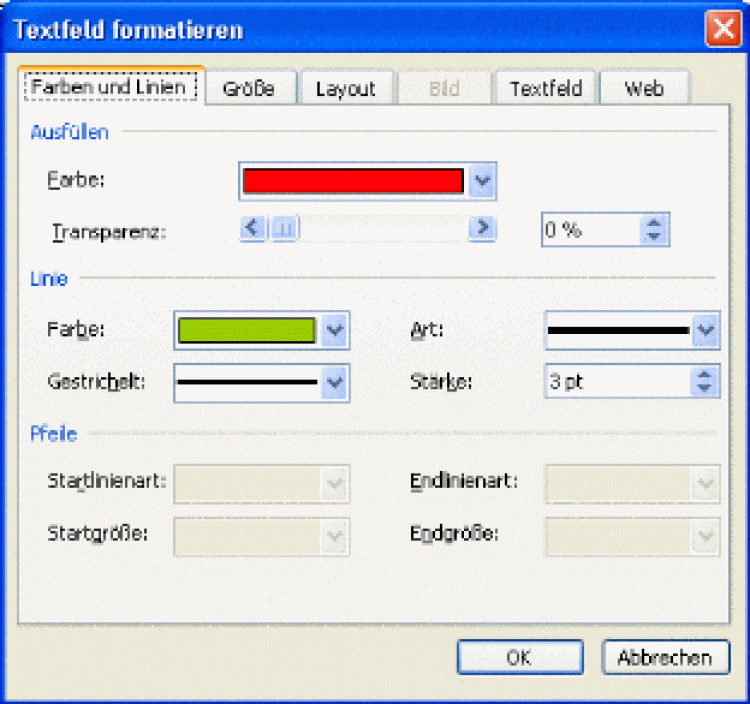 Dialogfenster Textfeld formatieren und im Register Farben und Linien den Bereich Linie wählen. |
