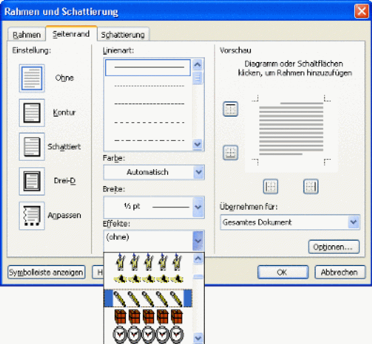 Gehen Sie in das Format-Menü und den Menü-Punkt Rahmen und Schattierung... zum Register Seitenrand. Wählen Sie das gewünschte Randdesign im Listenfeld Effekte aus.