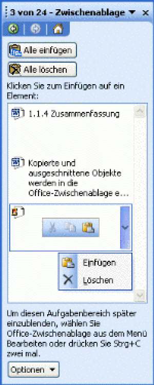 In der Office-Zwischenablage können bis zu 24 kopierte oder ausgeschnittene Elemente aus allen Office-Programmen und auch anderen Programmen abgelegt werden. Sobald Sie zwei Mal hintereinander einen Befehl zum Kopieren oder Ausschneiden gegeben haben, wird sie im Aufgabenbereich automatisch aufgerufen. Wollen Sie die Zwischenablage unabhängig davon einblenden, so können Sie das über das Menü Bearbeiten und die Office-Zwischenablage... oder über die Tastenkombination STRG+C+C tun.