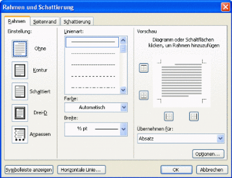 Im Register Rahmen sind in weiterer Folge die Standardvorgaben Kontur, Schattiert, Drei-D oder Anpassen und anschließend die Linienart sowie deren Breite und Farbe zu wählen. Wird nur eine Linie an einer Seite des Absatzes gewünscht, kann dies durch Klicken auf die vier Symbole (Modellrahmen) im Bereich Vorschau erzielt werden. Ein erneutes Anklicken schaltet die Linie für diesen Bereich wieder aus/ein.