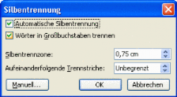 Das aktivierte Kontrollkästchen Wörter in Großbuchstaben trennen bezieht ebendiese in die Silbentrennung mit ein. Je größer die Silbentrennzone definiert ist, desto weniger Wörter werden getrennt. Das Feld Aufeinanderfolgende Trennstriche ermöglicht die Einstellung, wie viele unmittelbar aufeinander folgende Zeilen maximal getrennt werden dürfen.