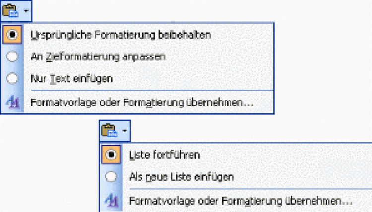 Welche Optionen verfügbar sind, ist abhängig vom einzufügenden Inhalt, vom Quellprogramm und von der Formatierung des Zieltextes. Sie können z.B. festlegen, ob: