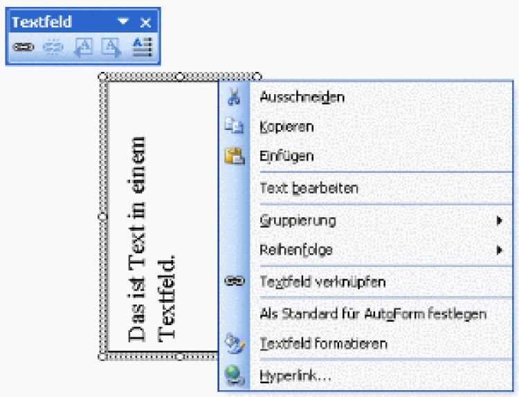 Mit dem Symbol Textrichtung ändern der Textfeld-Symbolleiste können Sie den Text auch quer schreiben. Das Symbol Textfeld verknüpfen erlaubt das Verbinden von zwei Textfeldern durch einen Mausklick. Das Verknüpfen von Textfeldern macht es möglich, dass Sie Text in einem Teil des Dokuments beginnen lassen und in einem anderen Teil fortsetzen.