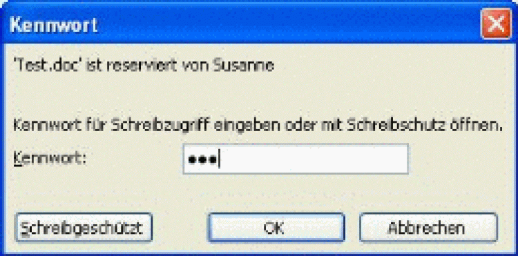 • Sie werden jetzt jedesmal, wenn Sie die Datei öffnen, nach dem zugehörigen Kennwort für den Schreibzugriff gefragt. Nach Eingabe der Zeichenfolge, die die Datei schützt, wird der Schreibschutz aufgehoben.