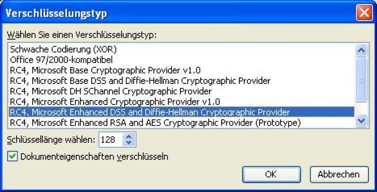 Seit der Version Word 2002/XP wurde die Verschlüsselung der Dateien im Vergleich zu den Vorgängerversionen verbessert. In den älteren Word Versionen wurde lediglich mit einem symmetrischen RC4 Verschlüsselungsalgorithmus gearbeitet. Dabei werden die Daten mit Hilfe von Algorithmen codiert. Jetzt haben Sie die Möglichkeit, zwischen verschiedenen Verschlüsselungstypen zu wählen: