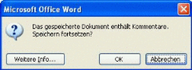 Wenn Sie das Kontrollkästchen vor "Warnung anzeigen, bevor eine Datei, die Überarbeitungen oder Kommentare enthält, gedruckt, gespeichert oder versendet wird", aktivieren, erhalten Sie beim Drucken, Speichern oder Versenden der Datei ggf. den Hinweis, dass die Datei Kommentare enthält. Sie haben die Möglichkeit, den Vorgang abzubrechen und evtl. Kommentare, die nicht für Dritte bestimmt sind, zu entfernen.