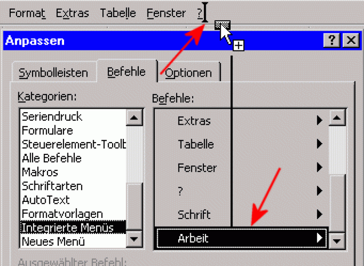 Rollen Sie im linken Bereich bei Kategorien zum Punkt Integrierte Menüs bzw. Eingebaute Menüs (Word 2000) und markieren Sie ihn.