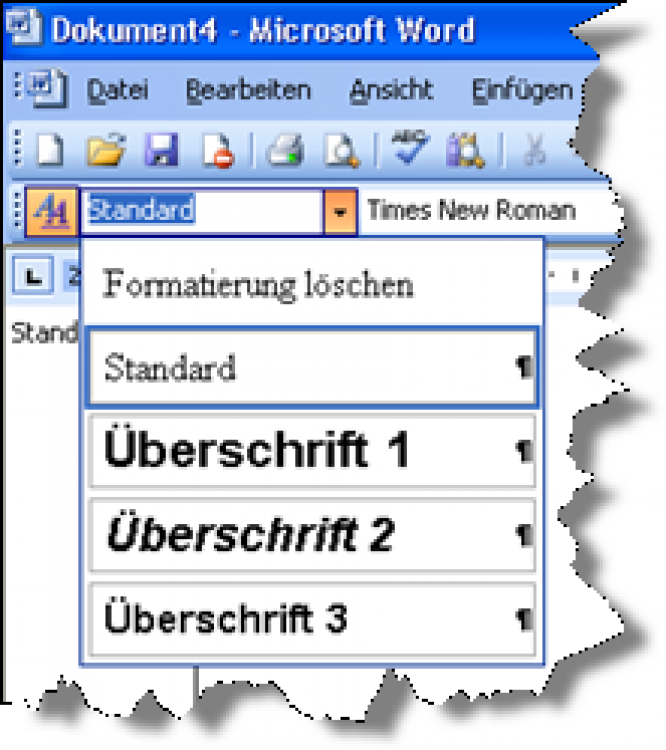 Diese Formatvorlagen wählen Sie beispielsweise aus der Format-Symbolleiste aus. Dort findet sich ganz links eine Liste, in welcher normalerweise der (Formatvorlagen-)Name Standard zu sehen ist.
