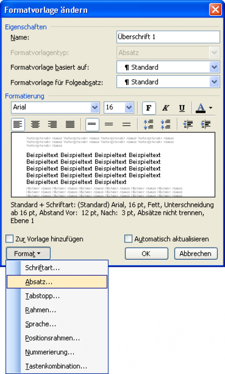 Die anfangs lokal eingestellte Eigenschaft Absätze nicht trennen ist wie alle anderen auch zentral in jeder Formatvorlage änderbar, hier im Schaltflächen-Menü Format/Absatz: