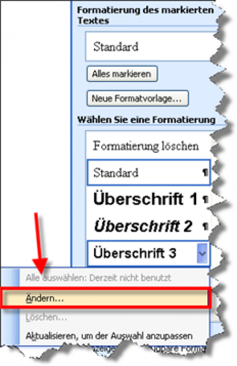 Klicken Sie im Arbeitsbereich Formatvorlagen und Formatierungen auf den DropDown-Pfeil und wählen Sie dort das Menü Ändern wie im folgenden Bild:
