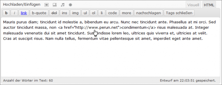 Möchten Sie ein Wort oder einen Abschnitt Ihres Textes verlinken, so markieren Sie das Wort bzw. den Bereich und klicken dann auf den Button "link". Daraufhin öffnet sich ein Fenster, in das Sie die URL, also die Zieladresse der Verlinkung eintragen.