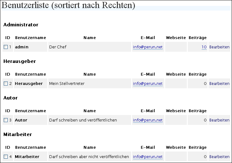 Redakteur – darf Seiten und Artikel verfassen und kann eigene und Artikel anderer Benutzer verwalten und freigeben ("Geschäftsführer").