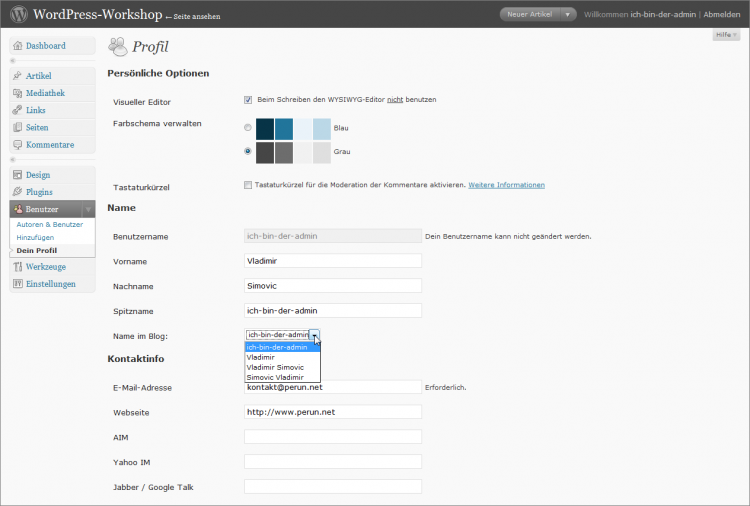 Neben einigen weiteren Angaben können Sie auch entscheiden, welcher Name angezeigt werden soll, wenn Sie unter diesem Account einen Artikel oder eine Seite erstellen. Achten Sie hierbei bitte darauf, dass der Benutzername nicht als Anzeigename im Frontend (Öffentlicher Name) fungiert (ist leider Standardeinstellung), weil dadurch ein möglicher Angreifer direkt auch den Loginnamen erkennen kann.