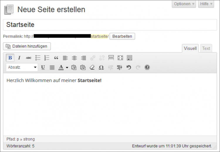 Wie Sie die zukünftige Startseite betiteln und welchen Inhalt Sie dort einfügen möchten, ist völlig Ihrer Phantasie überlassen. Sie können ruhig den Inhalt der Startseite Ihres bestehenden oder des zukünftigen Projektes einfügen. Wenn Sie noch keinen Inhalt für die Startseite haben, können Sie sich vom Blindtextgenerator einige Absätze generieren lassen.