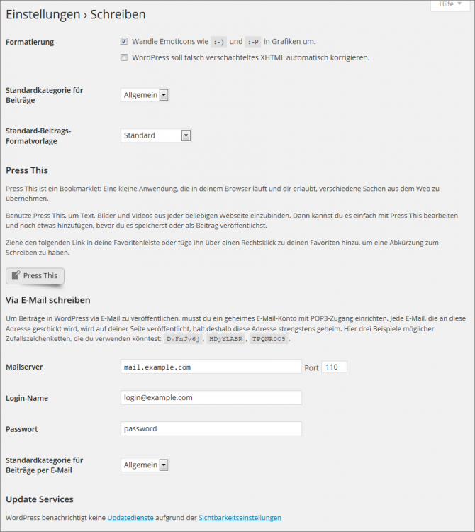 Wie Sie in der oberen Abbildung sehen, können Sie bei WordPress auch via E-Mail Ihre Artikel veröffentlichen. Dafür müssen Sie ein E-Mail-Konto einrichten, das nur Sie kennen, denn alle E-Mails, die Sie an diese Adresse schicken, werden als Weblog-Artikel veröffentlicht. Ich würde Ihnen empfehlen, ein exotisches Präfix für die Adresse einzusetzen.