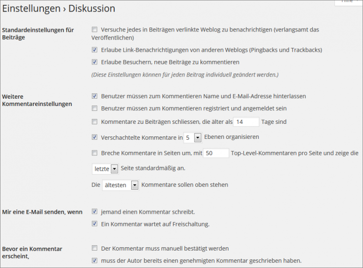 Beim vierten Punkt können Sie einstellen, ob ein Kommentar erst erscheint, wenn er vom Admin freigegeben wird, ob der Kommentator Name und E-Mail-Adresse angeben muss und ob der Kommentar erst erscheint, wenn der Kommentator bereits einen Kommentar abgegeben hat, der freigegeben wurde.