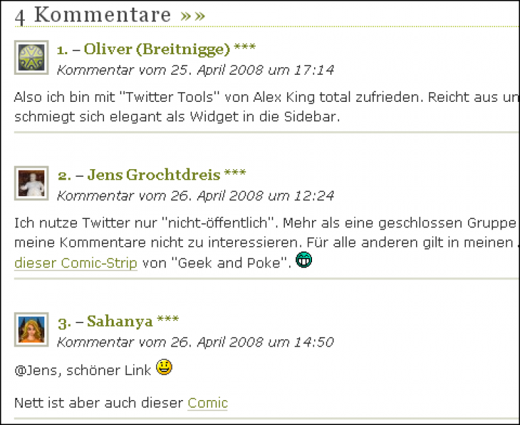 Seit der Version 2.5 ist in diesem Bereich eine weitere Funktion hinzugekommen. Sie können entscheiden, ob bei den Kommentaren auch die Gravatare angezeigt werden. Gravatare sind kleine, personalisierte Grafiken, die den Kommentaren eine persönliche Note geben. Bei dem Dienst Gravatar.com kann sich jeder registrieren, eine Grafik hinterlegen und diese Grafik mit der eigenen E-Mail-Adresse "verknüpfen". Schreibt man jetzt einen Kommentar in einem Weblog, welches Gravatare anzeigt, und wird diese E-Mail-Adresse im entsprechenden Feld eingegeben, erscheint die individuelle Grafik. Hier ein Beispiel aus meinem Weblog :