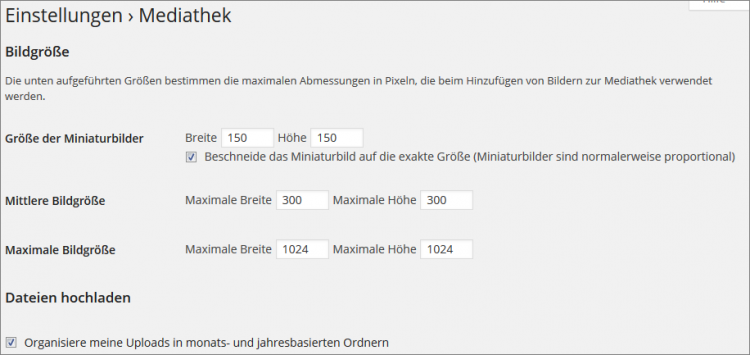 Sie haben hier die Möglichkeit, die Größe eingebundener Bilder zu bestimmen. Wenn Sie ein Bild in WordPress hochladen und einbinden, bietet WordPress Ihnen die Möglichkeit das Bild in voller Größe einzubauen oder auf eine der drei Vorschau-Größen auszuweichen, wenn das Bild zu groß ist.