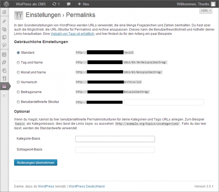 Unter "Optional" haben Sie zudem die Möglichkeit, die Kategoriebasis in der URL anzupassen. Üblicherweise – nachdem sprechende URLs erzeugt wurden – ist eine Kategorieadresse so aufgebaut: