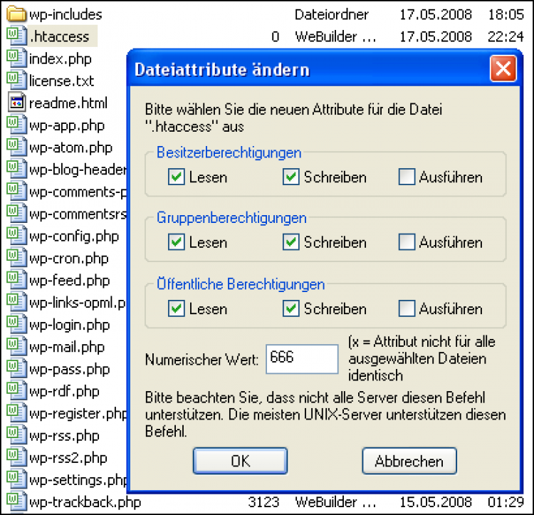 Nach dem Sie die a.htaccess in den Hauptordner Ihrer WordPress-Installation hochgeladen und auf dem Server in .htaccess umbenannt haben, müssen Sie diese beschreibbar machen. Das bedeutet, dass Anwendungen auf dem Server – in unserem Fall WordPress – auf diese Datei zugreifen und auch beschreiben können. Dafür muss diese Datei CHMOD 666 bekommen: