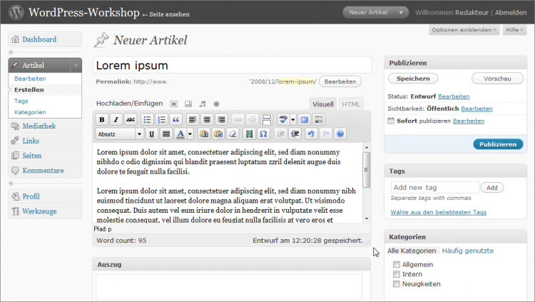 Um einen Artikel in WordPress zu verfassen, müssen Sie sich auf die Unterseite "Artikel » Erstellen" (links in der Navigation) bzw. "Neuer Artikel" (Dropdown-Menü im Kopfbereich) begeben.