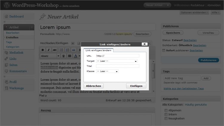 Klasse: Hier kann man den Link einer bestimmten Klasse zuordnen. Dies beeinflusst das Aussehen des Links, ist aber bei der "normalen" redaktionellen Arbeit nicht notwendig. (Optional)
