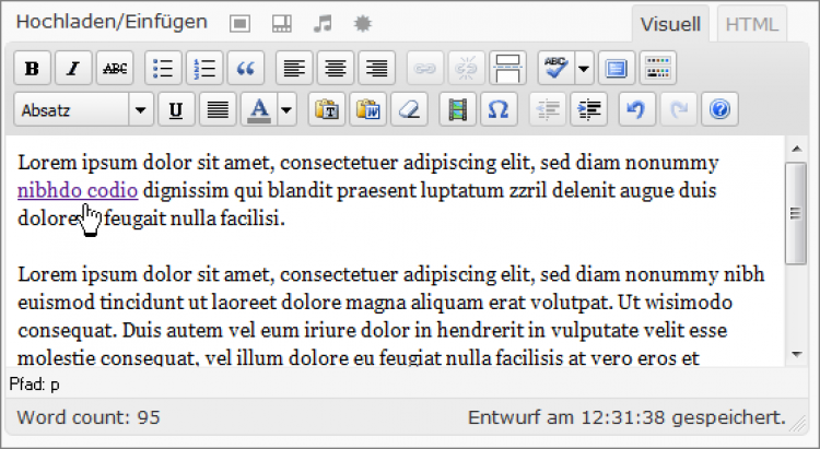 Haben Sie alle notwendigen Angaben (URL, evtl. Target) gemacht, klicken Sie auf den Button "Einfügen". Der verlinkte Text erscheint daraufhin unterstrichen. Wenn Sie nachträgliche Änderungen vornehmen möchten, setzen Sie den Cursor "in" den verlinkten Bereich und klicken erneut auf den Button "Link einfügen/ändern".