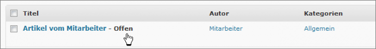 Eine Ihrer Aufgaben könnte also auch das Moderieren von Artikeln sein. Mitarbeiter eines Blogs können nämlich Artikel verfassen, diese aber nicht veröffentlichen, sondern nur "Zur Revision vorlegen". Diese Artikel sind dann in der Übersicht gelistet und mit dem Vermerk "Offen" versehen.