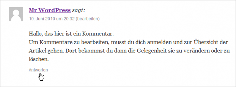 Ist ein Kommentar erschienen und Sie möchten Ihn beantworten, können Sie dies entweder im Frontend machen, indem Sie dort auf den Link "Antworten" klicken und dann das Kommentar-Formularfeld ausfüllen, so wie es jeder Besucher in Ihrem Blog auch machen würde, oder Sie beantworten den Kommentar im Backend über den Link "Antworten", der bei dem jeweiligen Kommentar erscheint.