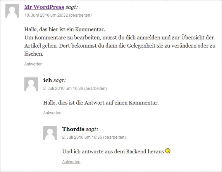 Aber was tun Sie, wenn es im Frontend den "Antworten"-Link nicht gibt? Und was ist passiert, wenn Sie im Backend zwar auf "Beantworten" geklickt haben, der Kommentar aber nicht verschachtelt angezeigt wird?