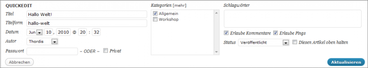 So haben Sie die Möglichkeit, den Titel, die Titelform, das Datum der Veröffentlichung, den Autor, den Passwortschutz bzw. das Passwort, die Kategorie, die Schlagwörter, die Diskussionsoptionen und den Status zu ändern, ohne dass der eigentliche Artikel geöffnet werden muss.