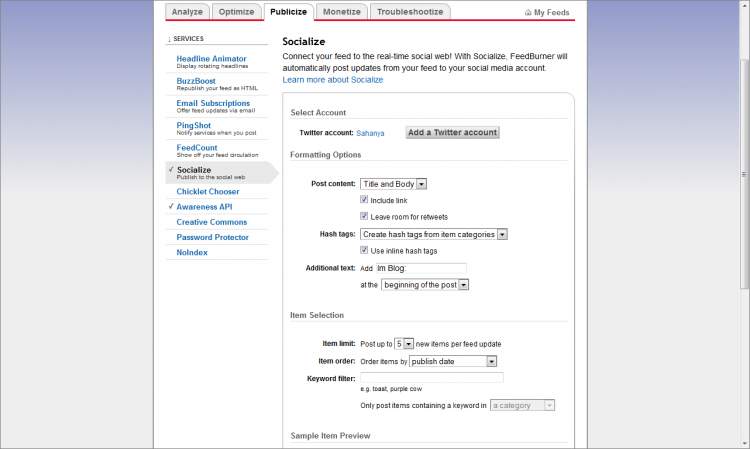 Auch mit dem Google Dienst FeedBurner kann man seinen Newsfeed in Twitter publizieren. Besonders interessant ist dabei die Möglichkeit den ausgegebenen Tweet automatisch mit Hashtags zu versehen.