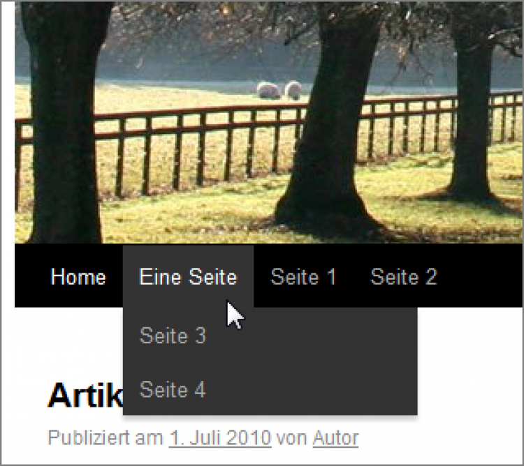 In der oberen Abbildung sehen Sie die Auswirkung im Frontend, wenn Sie das 2010-Theme (Standard) nutzen. Die Seiten Nr. 1 und Nr. 2 wurden als Elternseiten definiert (keine Übergeordnete) und die Seiten Nr. 3 und Nr. 4 bekamen als Eltern-Seite "Eine Seite".