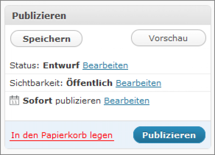 Wenn Sie einen "Entwurf" wieder geöffnet haben, also einen Artikel, den Sie zur späteren Bearbeitung gespeichert hatten, so zeigt das Publizieren-Modul natürlich keinen Veröffentlichungszeitpunkt an. Das Modul sieht dann so aus wie bei einem Artikel, der gerade neu erstellt wird.