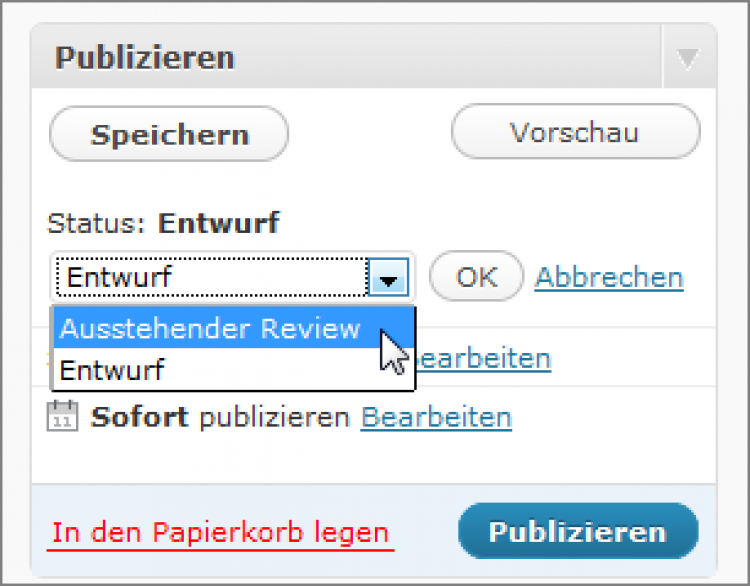 Um den Status des Artikels zu ändern, klicken Sie auf den "Bearbeiten"-Link und wählen Sie aus dem Dropdown-Menü einen anderen Status. Bei einem Entwurf wäre das: "Ausstehender Review". Wenn Sie diese Auswahl mit "OK" bestätigen, wird der Artikel nicht veröffentlicht, sondern zur Revision vorgelegt, d. h. der Administrator oder ein anderer Redakteur muss bzw. soll diesen Artikel vor der Veröffentlichung prüfen.