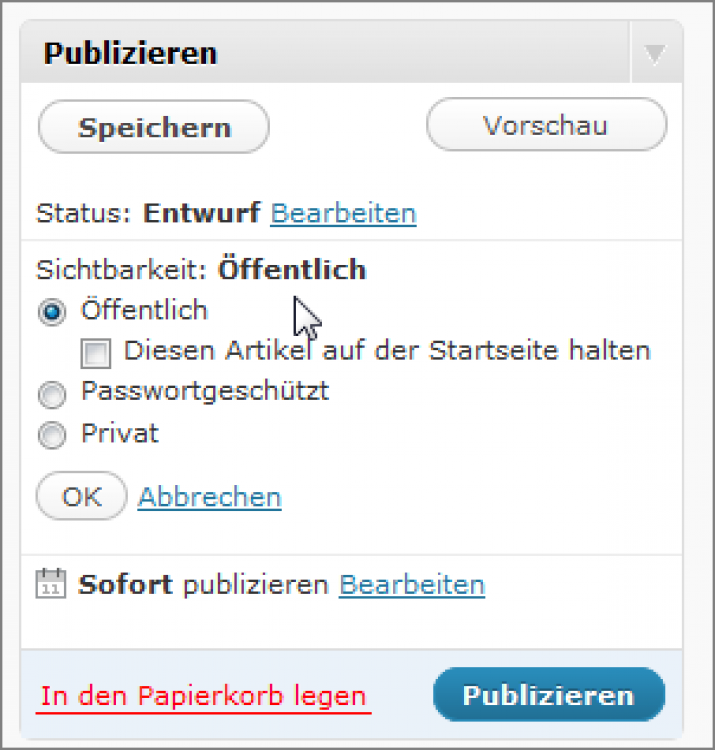 Hinter dem Stichwort "Sofort" verbirgt sich der Zeitpunkt der Veröffentlichung. Normalerweise wird der Artikel, den Sie publizieren, unmittelbar veröffentlicht.