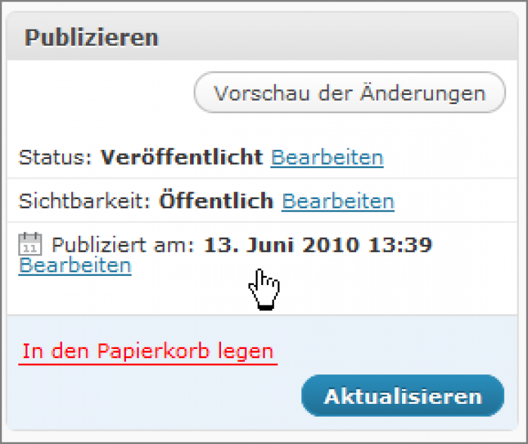 Wenn Sie dort mit der Maus über einen Artikel fahren, blenden sich die Links "Bearbeiten", " QuickEdit", "Papierkorb" und "Ansehen" ein. Um einen Artikel zu bearbeiten, klicken Sie auf den entsprechenden Link. Das Publizieren-Modul zeigt dann den Zeitpunkt der Veröffentlichung an und bietet Ihnen den Button "Aktualisieren" (Stichwort: kontextsensitiv) anstatt "Publizieren" an.