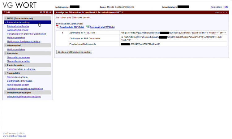 Diese Zählmarke wird Ihnen in zwei Varianten geliefert, als Zählmarke für HTML-Texte (also als Zählpixel) und als Zählmarke für PDF-Dokumente. Zusätzlich dazu erhalten Sie einen Privaten Identifikationscode.