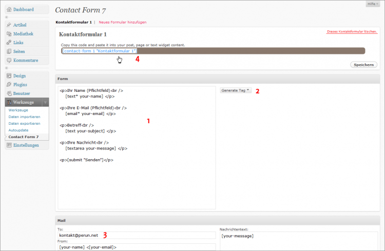 Mit dem Plugin Contact Form 7 haben Sie eine sehr komfortable Möglichkeit, Kontaktformulare zu erstellen. Nach der Aktivierung des Plugins erscheint unter "Werkzeuge" ein neuer Unterpunkt: