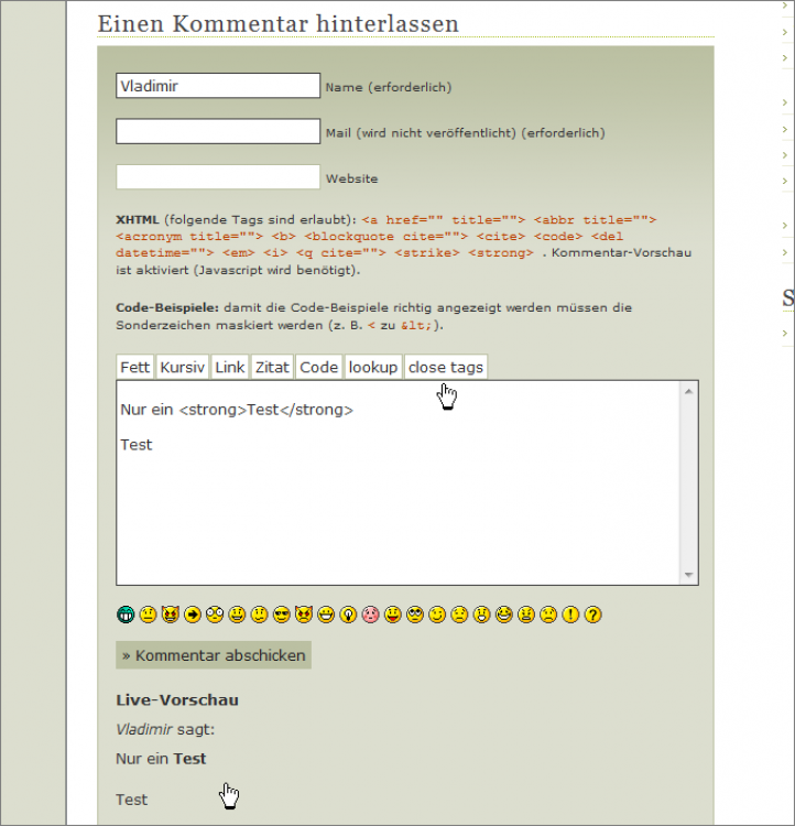 Abbildung 22: Comment-Quicktags und die Live-Vorschau im Einsatz