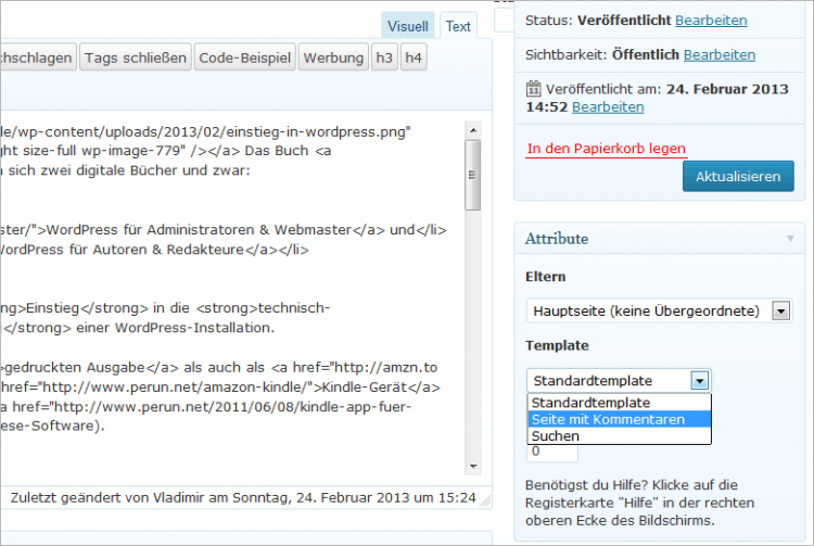 Dieses Code-Fragment kommt ganz am Anfang eines Seiten-Templates und es handelt sich hier um einen PHP-Kommentar, der WordPress signalisiert, dass diese Template-Datei ein Seiten-Template ist. Wenn ich die neu erstellte page-kommentare.php in den Themes-Ordner hochlade, dann habe ich im Backend die Möglichkeit neuen und bestehenden Seiten dieses Template zuzuweisen.